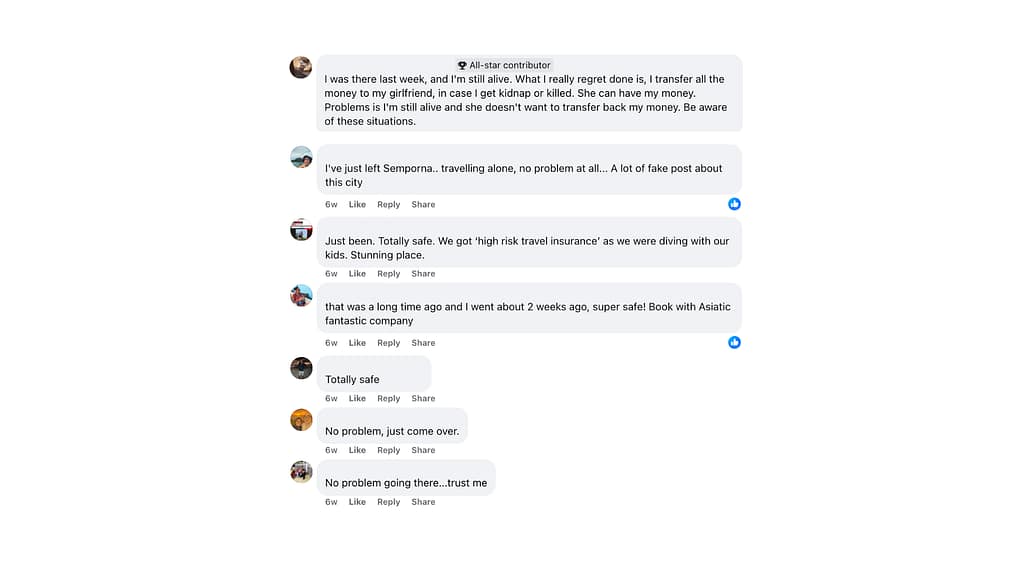 But then you read the recent posts. One solo traveller said, “I have just left Semporna, travelling alone, no problem at all. A lot of fake posts about this city.” Another wrote, “That was a long time ago. I went two weeks ago, super safe. Book with Asiatic. Fantastic company.” Even someone diving with kids said, “Just been. Totally safe. We got high-risk travel insurance and it was a stunning place.”