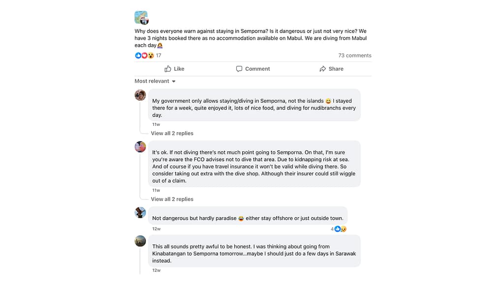 A recent traveller asked the same thing in a popular Facebook group. They had booked three nights in Semporna because Mabul was fully booked and were wondering why so many people warned against staying there. The replies were a mix of everything. Some said to avoid it completely. One person even replied, “This all sounds pretty awful to be honest. Maybe I should just skip Semporna and head to Sarawak instead.” Others were unsure, mentioning things like travel insurance not being valid and old travel advisories from years back.